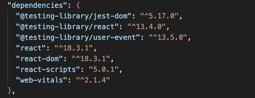 => 리액트 앱 실행, 빌드, 테스트 등의 스트립트가 명시되어 있음. 프로젝트에서 자주 실행해야 하는 명령어를 scripts로 작성해두면 npm 명령어로 실행 가능함
