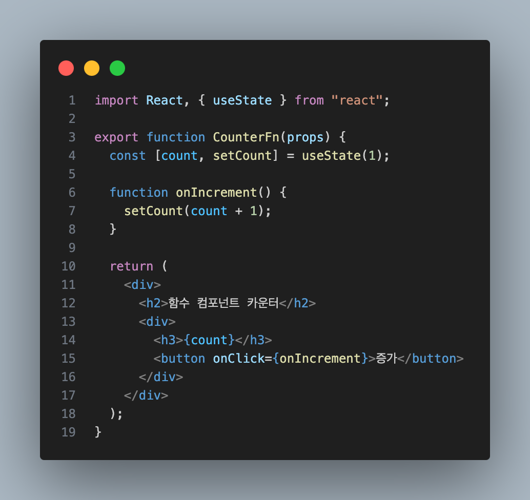 • setCount: 상태를 업데이트하는 함수. setCount를 사용해서 count 값을 변경할 수 있음.