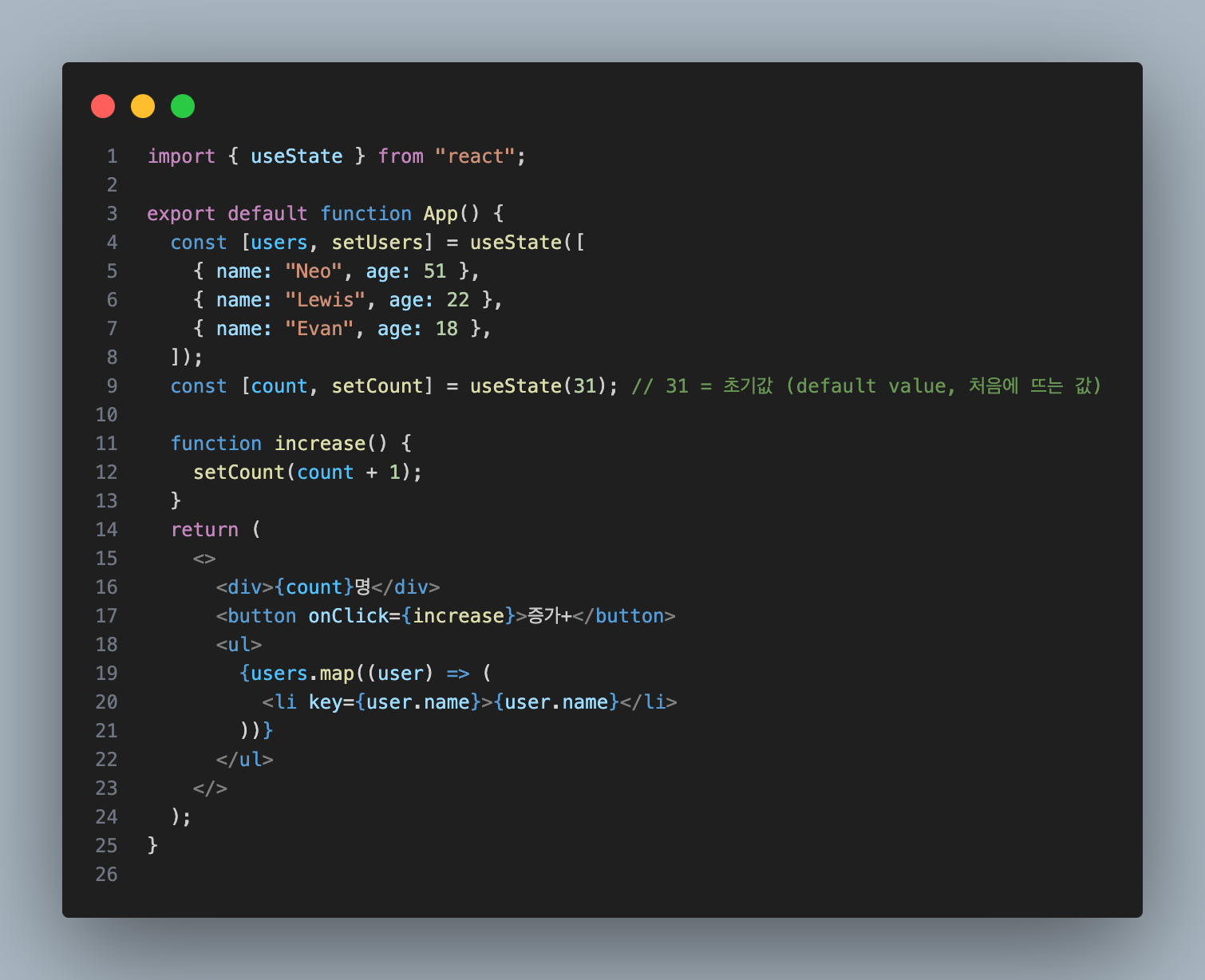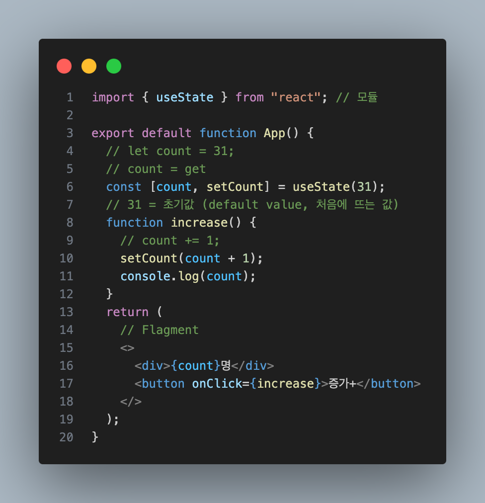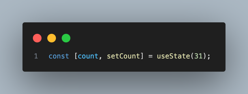 const [count, setCount] = useState(31); // 31 = 초기값 (default value, 처음에 뜨는 값)