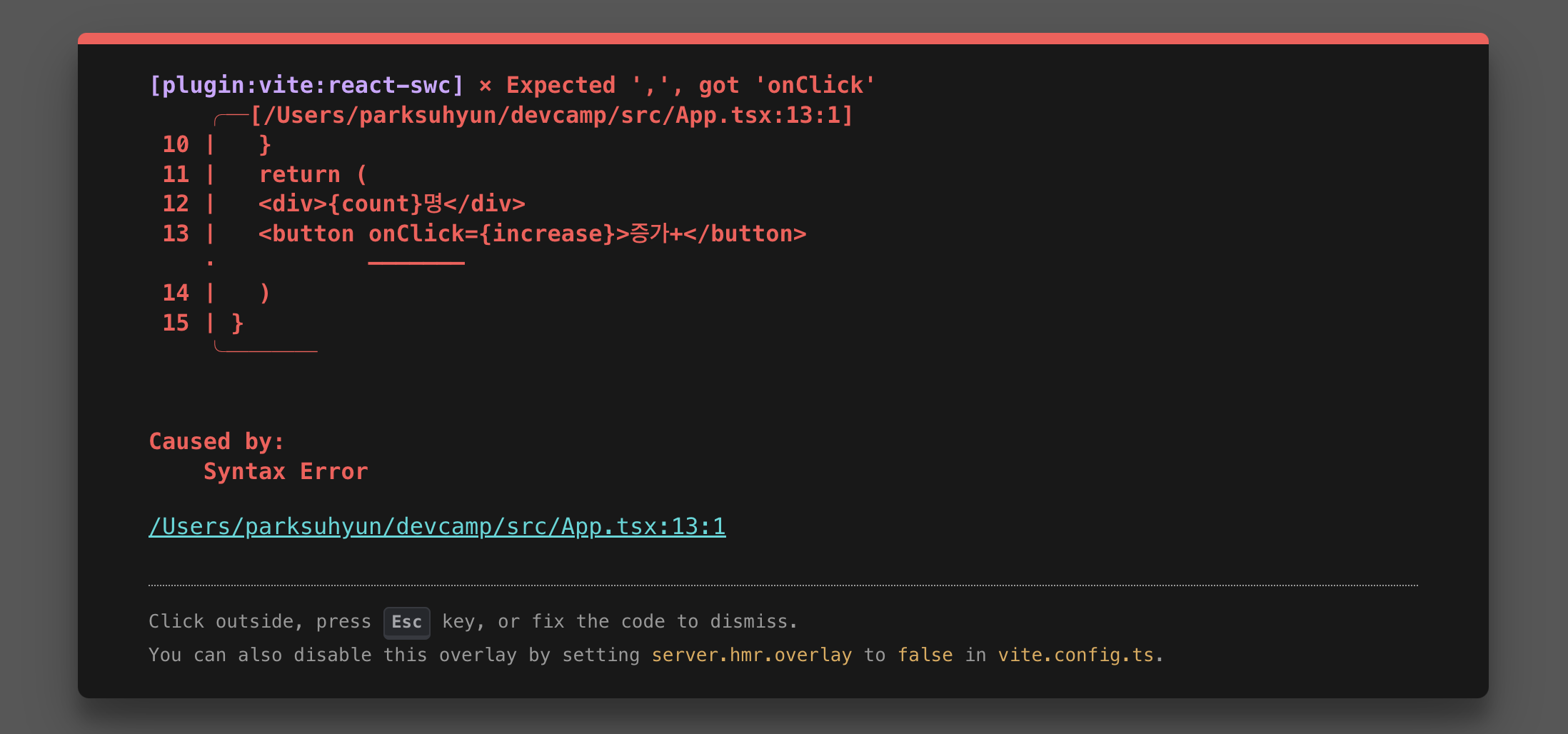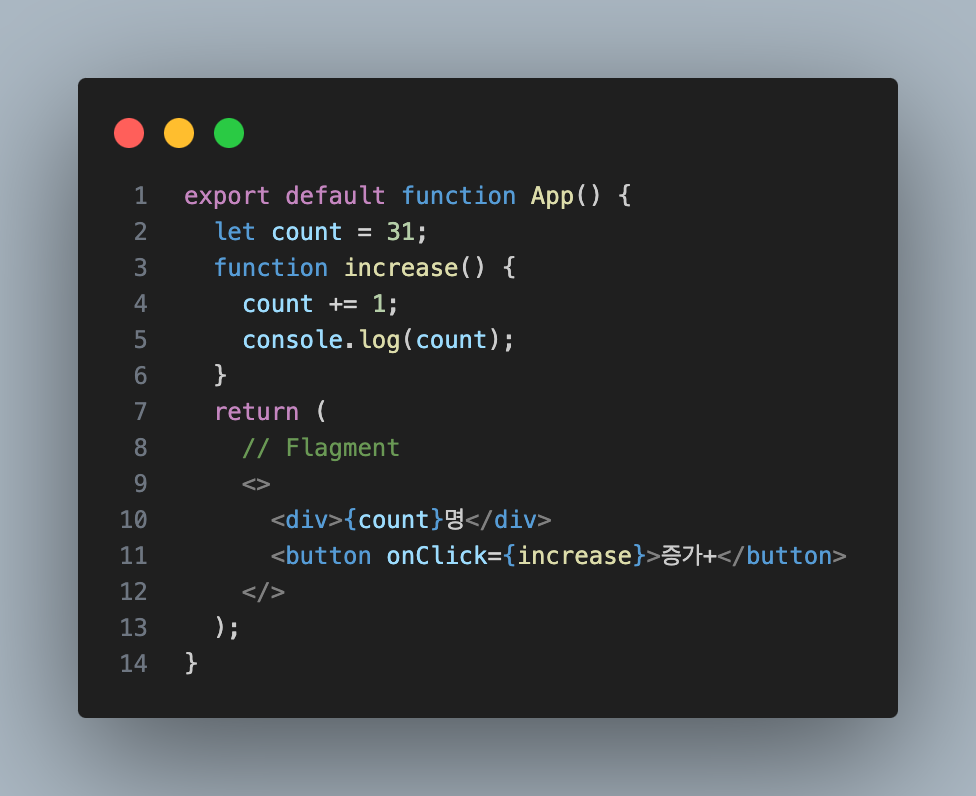 • <button onClick={increase}>증가+</button>: 클릭 시 increase 함수를 호출하여 count 값을 증가시킵니다.