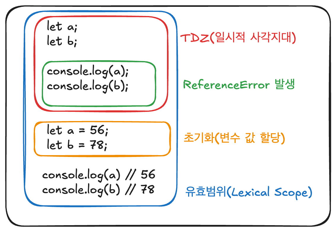 TDZ: 선언된 변수는 초기화되기 전까지 “일시적 사각 지대”에 있습니다. 초기화 전에 접근하면 ReferenceError가 발생합니다.