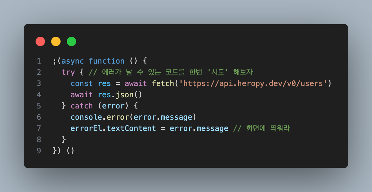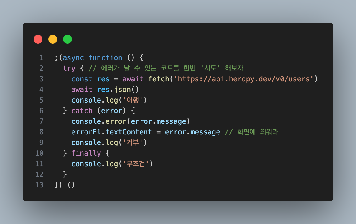 • catch (error): 던져진 에러를 잡아 error 변수에 저장합니다.