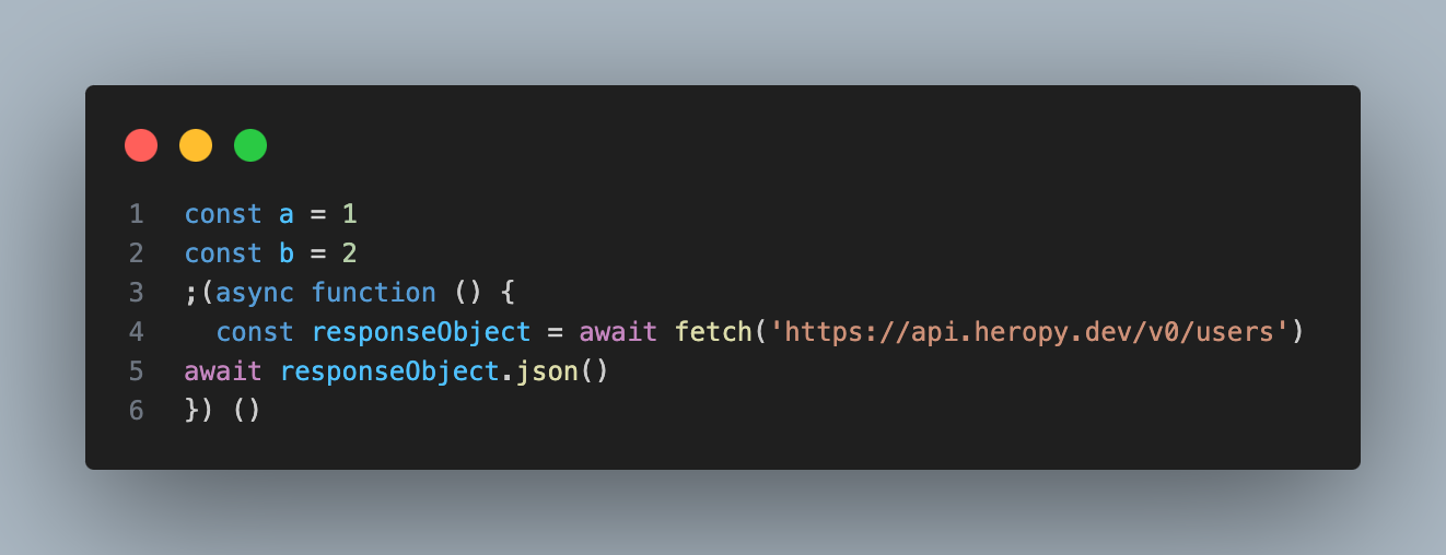 즉시실행함수 앞에 ';'을 붙여줌. 이렇게 하면 오류가 나지 않음
