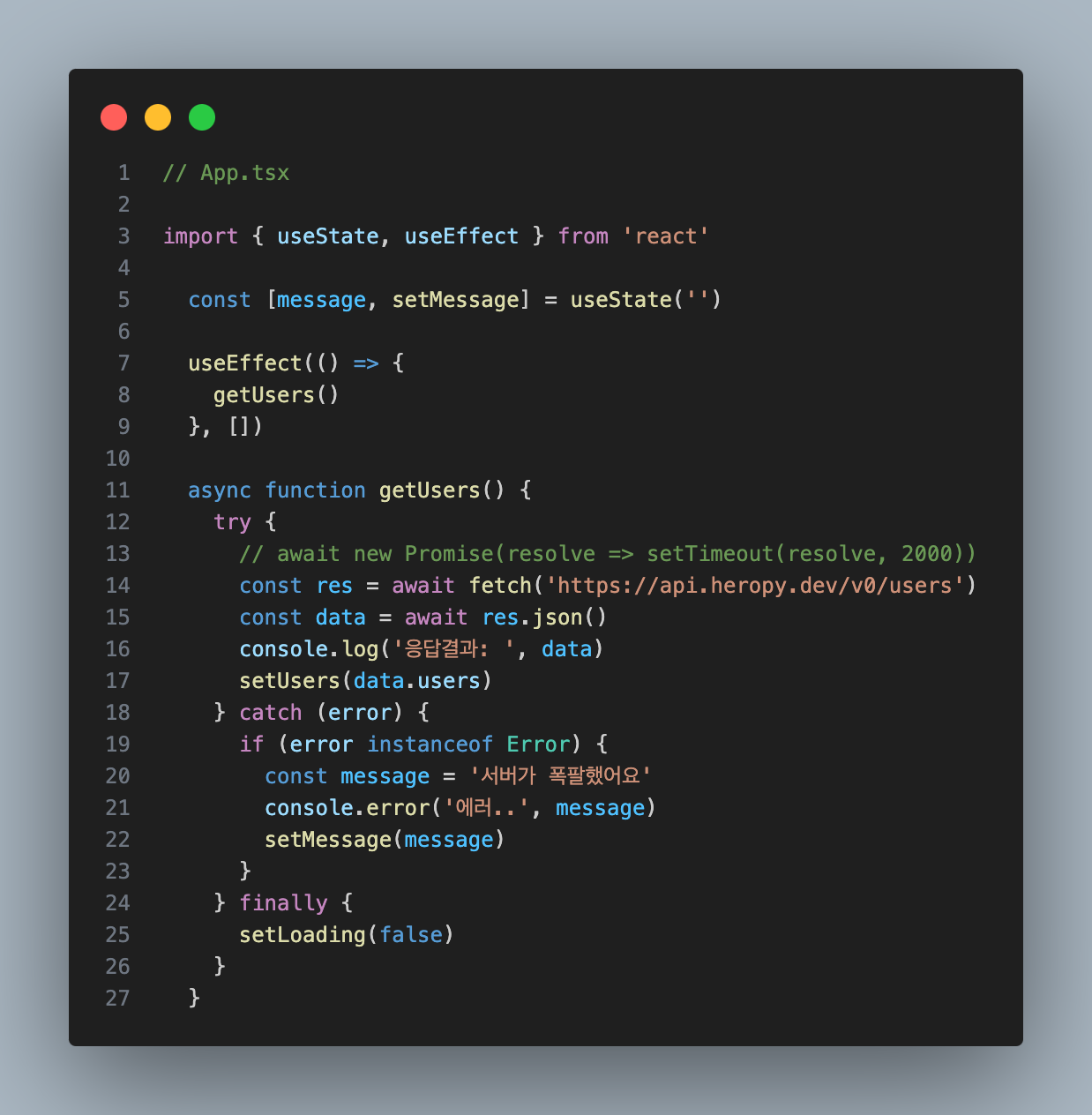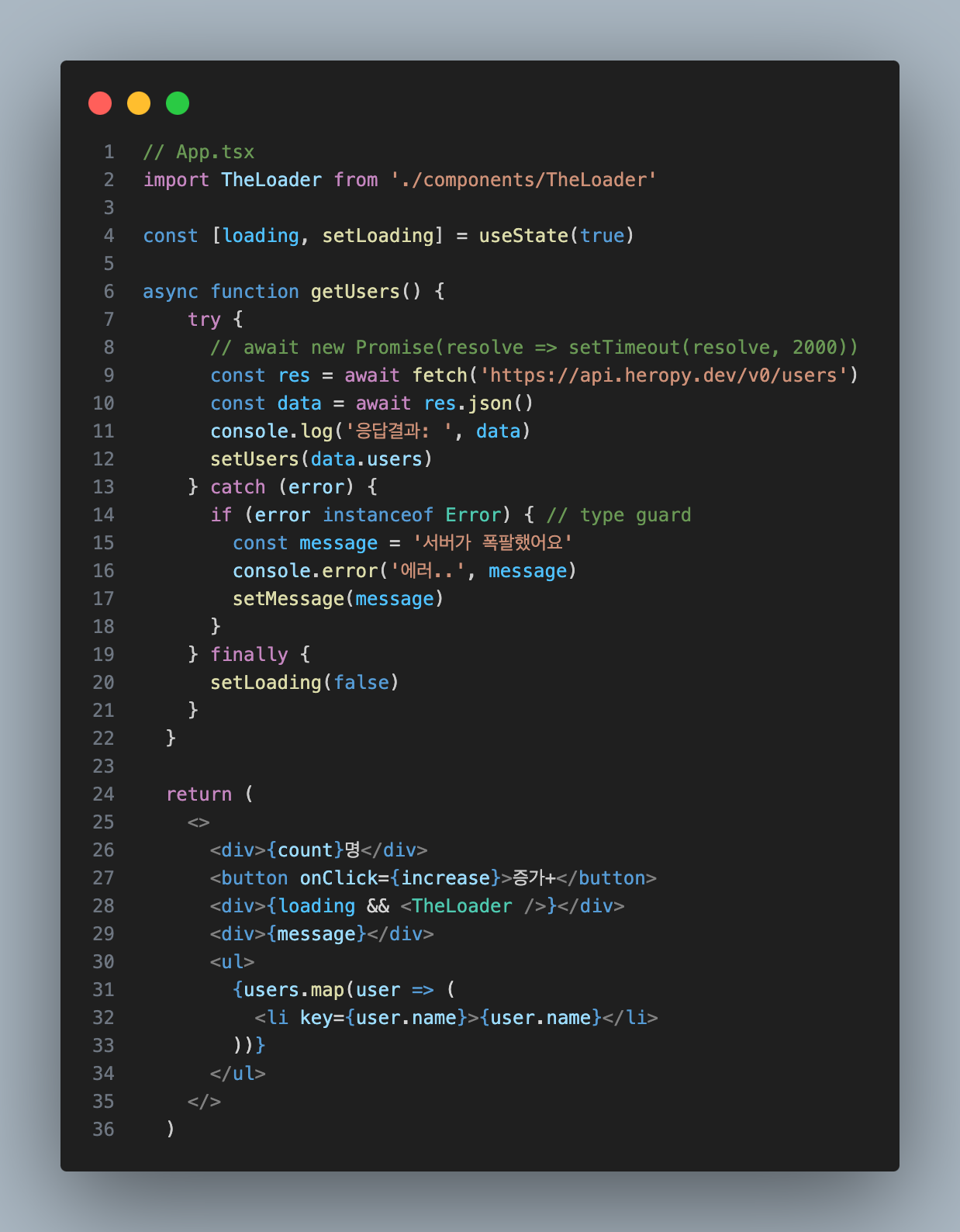 Beginner 4회차 2 (7/26) | 예외 처리하기(try/catch/finally) 실습, 로딩 애니메이션 컴포넌트화 실습 본문