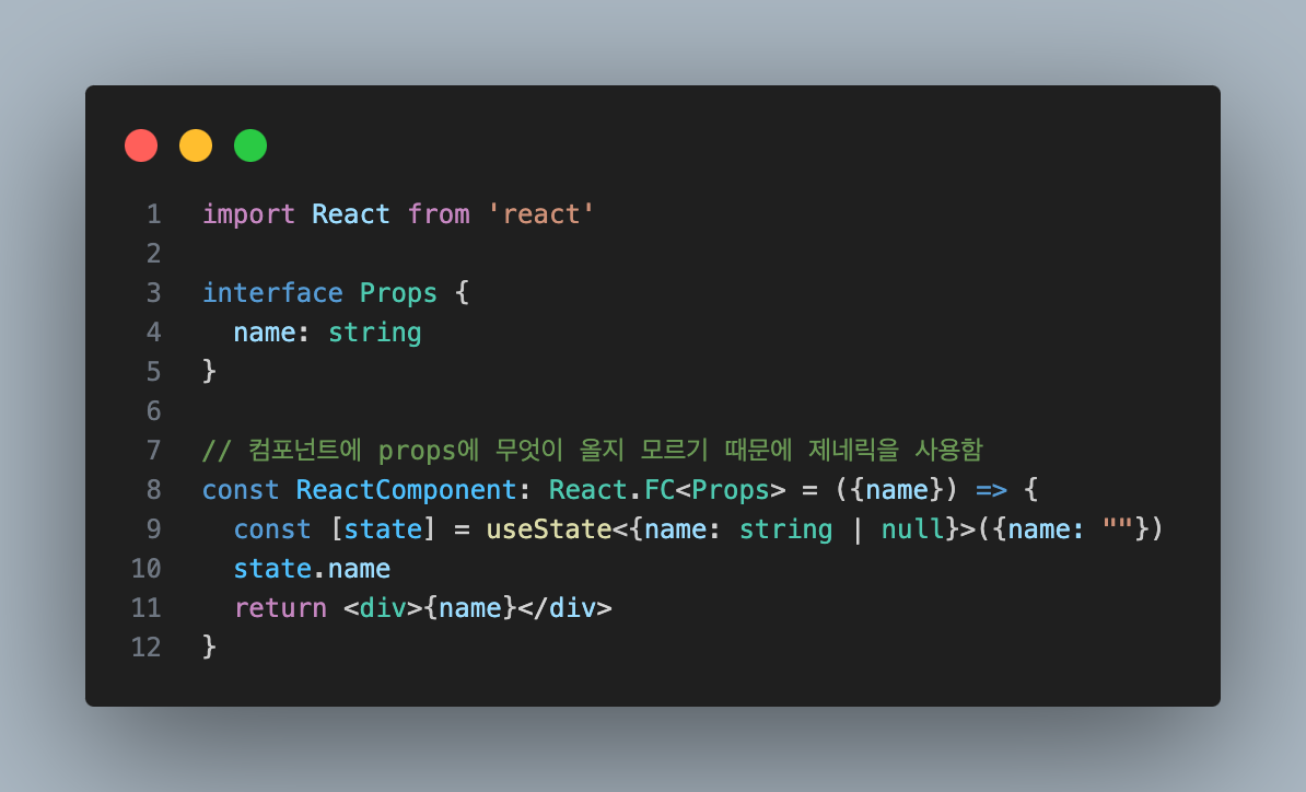 • useState 훅을 사용할 때 제네릭을 사용하여 상태의 타입을 지정합니다.