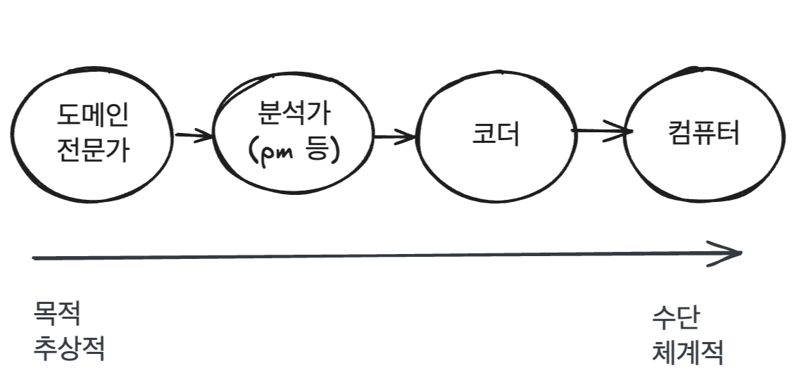 현재까지는 컴퓨터는 스스로 설계를 결정하지 않기 때문에 코더가 도메인 지식을 컴퓨터에 전달할 때엔 모든 요소들이 명확히 결정될 수 밖에 없음 --> 코더는 충분히 명확한 도메인 지식을 확보해야 함. 그렇지 않은 코더는 지식 흐름 상류에 지식 보장을 요청해야 함 (도메인 전문가, 분석가 등에게)