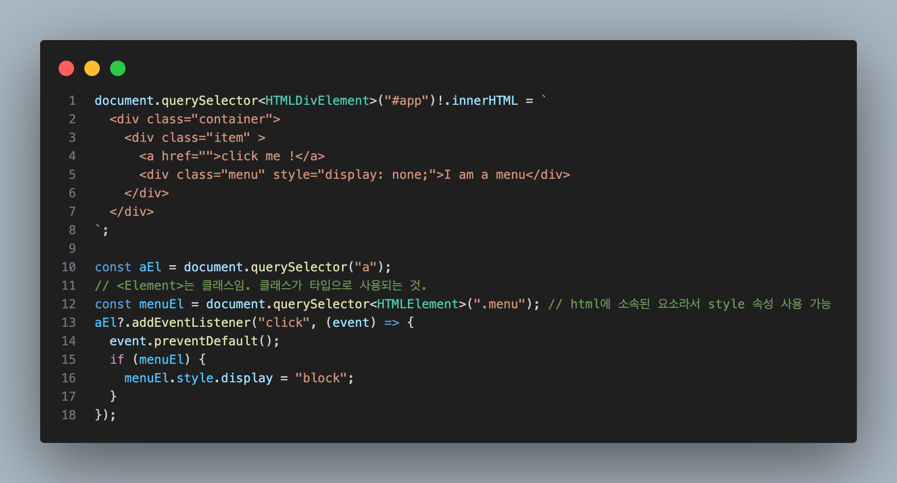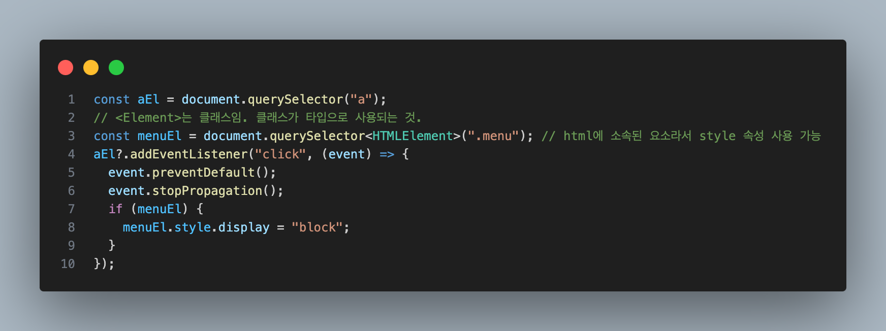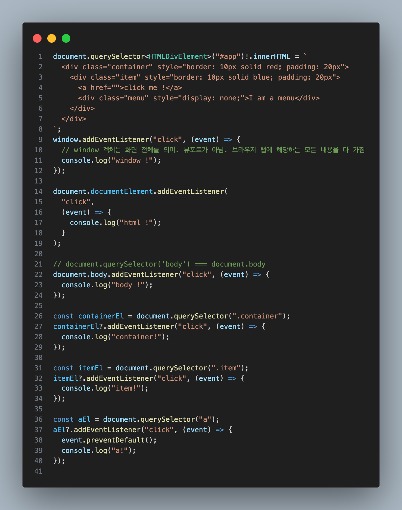 --> a 요소를 클릭하면 menu가 표시되는데 클릭 이벤트는 window에도 전파되므로, window의 클릭 이벤트 리스너가 실행되어 menu를 다시 숨김. menu가 짧은 시간 동안만 표시되고 바로 사라지기 때문에 우리가 화면에서 볼 수 없는 것 !
