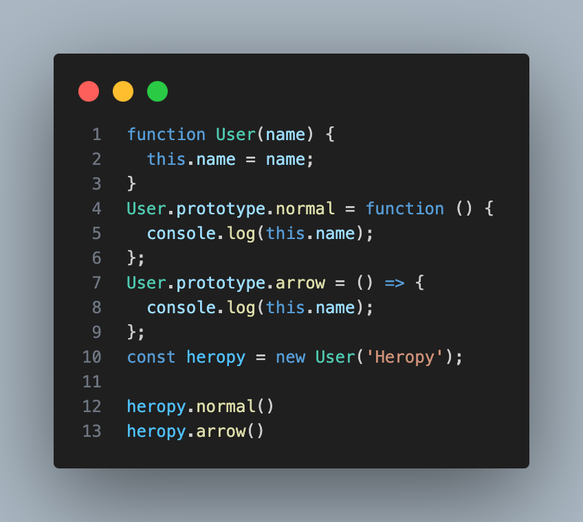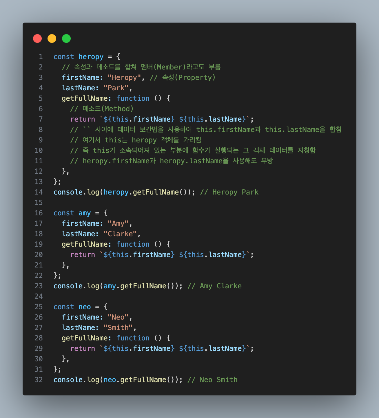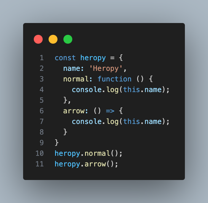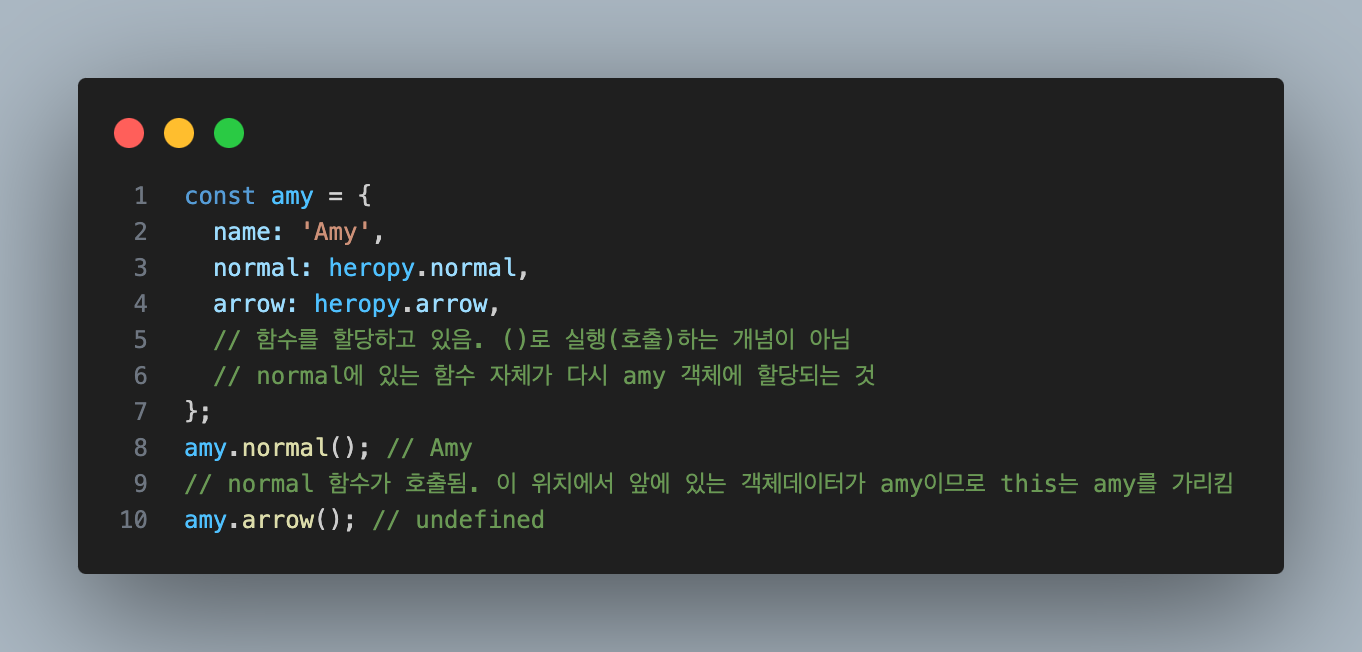// 여기에서 normal 함수가 호출됨. 이 위치에서 앞에있는 객체데이터가 heropy이므로 this는 heropy를 가리킴