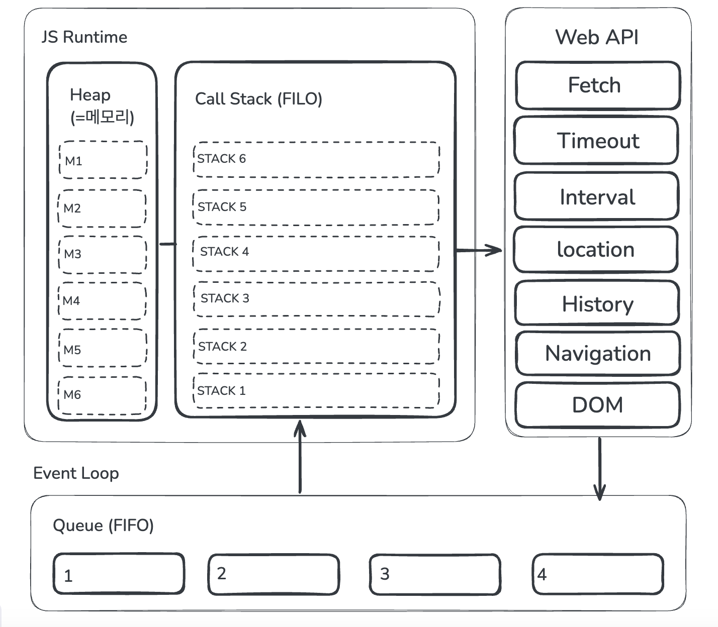 - 예: setTimeout, setInterval, I/O 작업, UI 렌더링 등