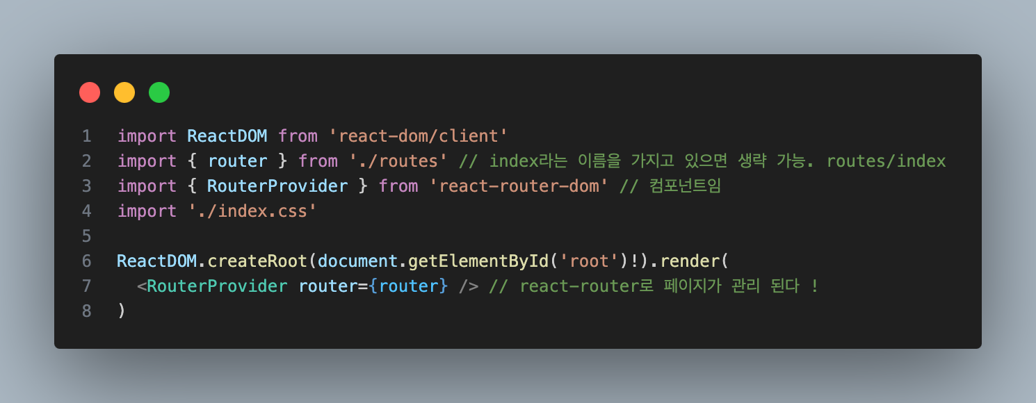 --> 이제 App.tsx 이 최상위 컴포넌트가 아니기 때문에(이제는 RouterProvider) Main.tsx로 이름 변경