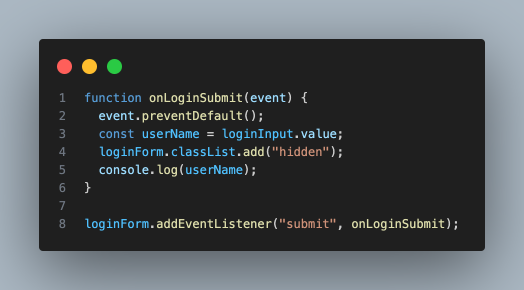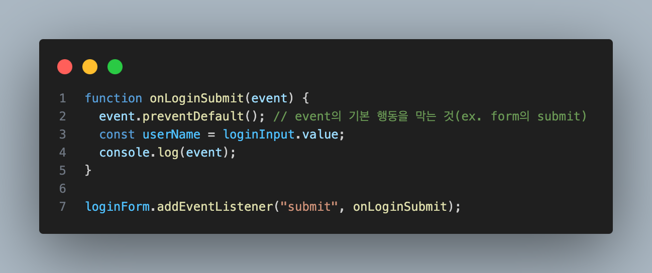 addEventListener로 submit 이벤트가 발생할 때 onLoginSubmit 함수가 호출되도록 만든 로직
