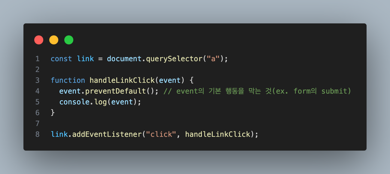 <a>의 기본 동작은 그 링크로 이동하는 것인데 event.preventDefault()를 사용해서 기본 행동을 막아서