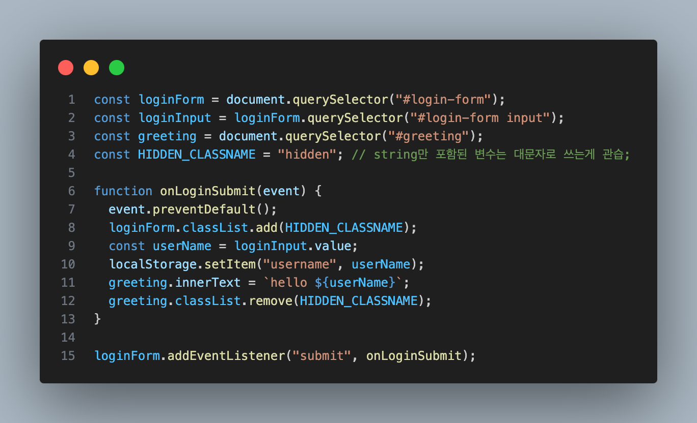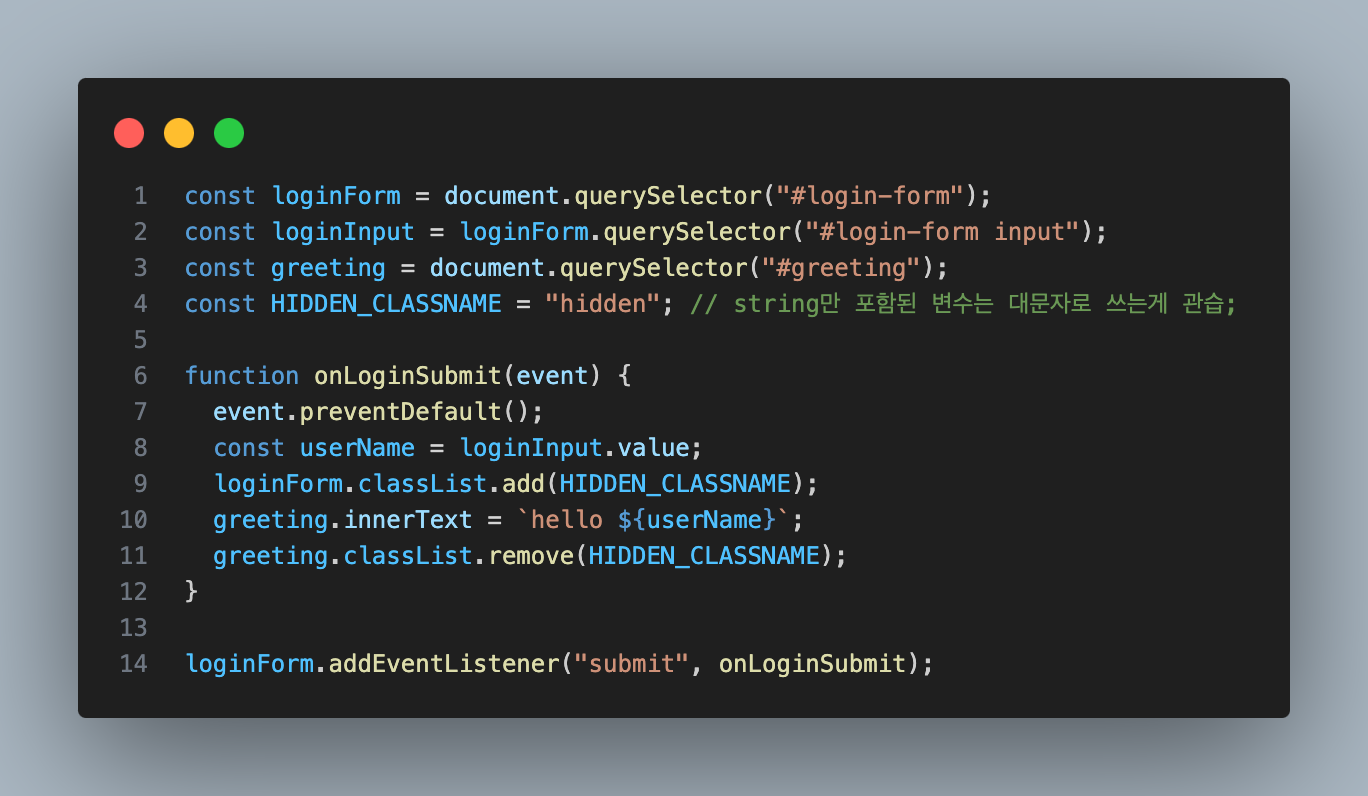 --> greeting에 hidden class를 삭제하고 innerText로 문장을 넣어준다.