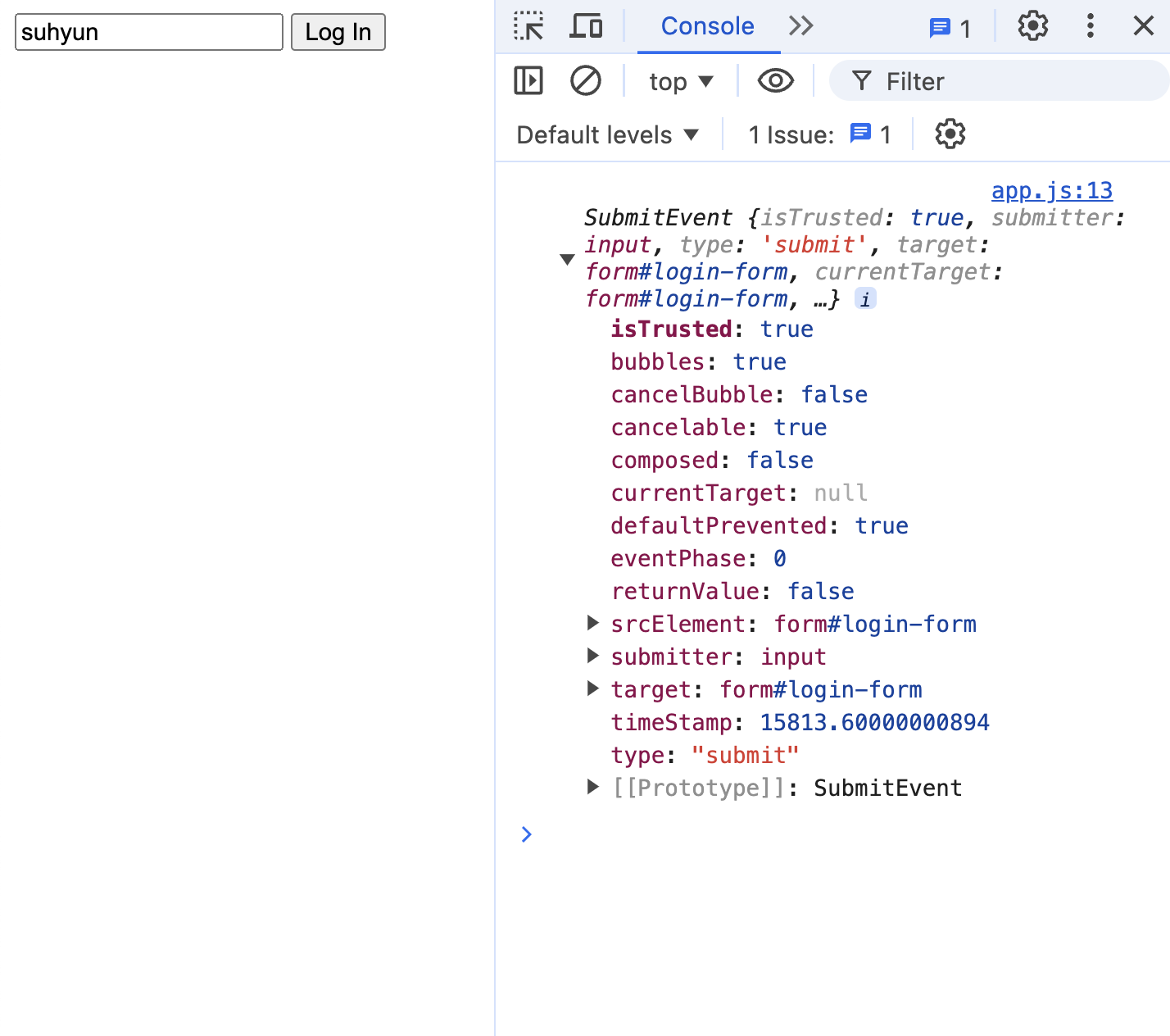 여기서 onLoginSubmit 함수에 event parameter를 넣어준 뒤 console 에서 확인해보자