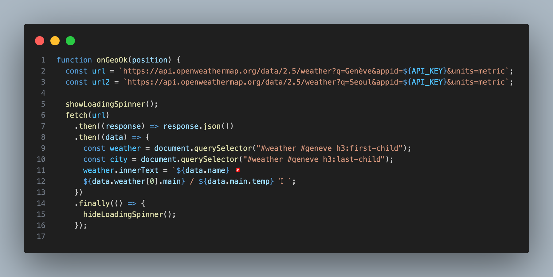 날씨의 경우 원래 서울의 날싸만 api를 가져와 띄우는 것이었는데, 개인적인 사심 가득 담아 제네바 날씨도 같이 가져오게 수정했다