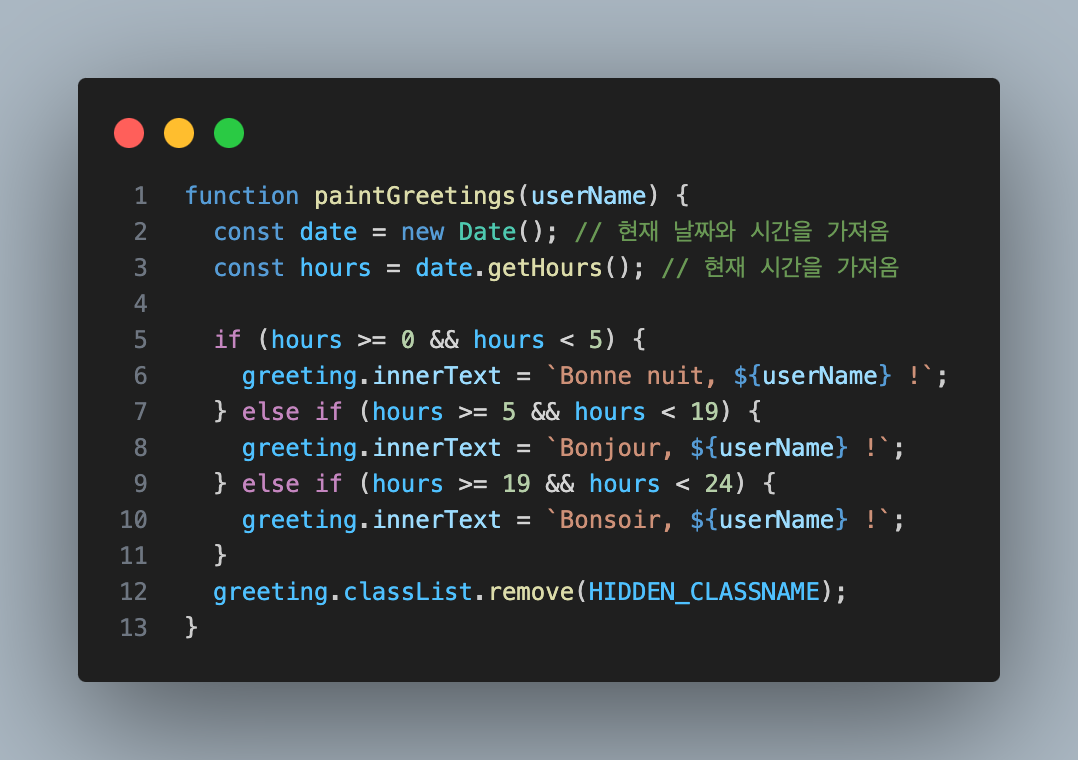 현재 시간을 불러오고 시간 범위를 나눠 각자 다른 인삿말을 넣었다