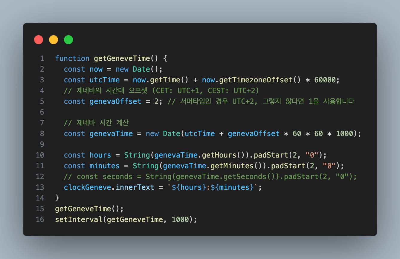 날씨를 띄우게 되면서 제네바 시간도 표시하는 로직을 만들어보았다.