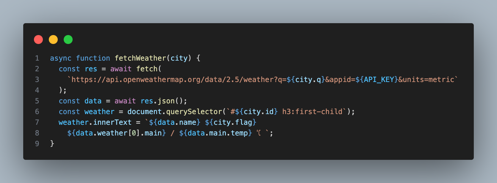 const res = await fetch(`https://api.openweathermap.org/data/2.5/weather?q=${city.q}&appid=${API_KEY}&units=metric`);