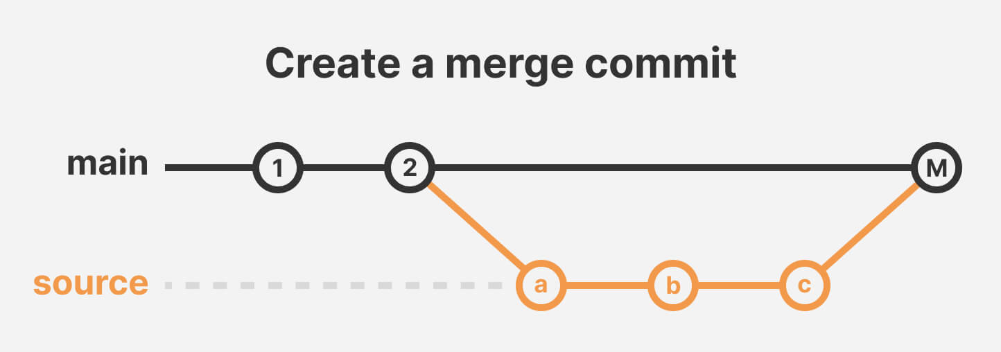 a, b, c 커밋 --> 이를 병합하는 하나의 새로운 커밋(M)이 대상 브랜치에 추가 및 연결됨