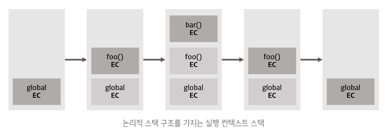 자바스크립트 코드를 실행 --> 콜스택에 전역 실행 컨텍스트를 담음 --> 전역에서 함수 foo를 호출하면 --> foo의 실행 컨텍스트를 만들어서 콜스택에 담음 (콜스택에서는 가장 최근에 추가된 콜스택만 활성화됨) -> 함수 bar를 호출하면 --> bar의 실행 컨텍스트를 만들어서 콜 스택에 담음 --> 가장 최근에 추가된 bar 부터 실행 --> bar 콜스택에서 삭제 --> foo 실행 --> foo 콜스택에서 삭제 --> 전역 실행