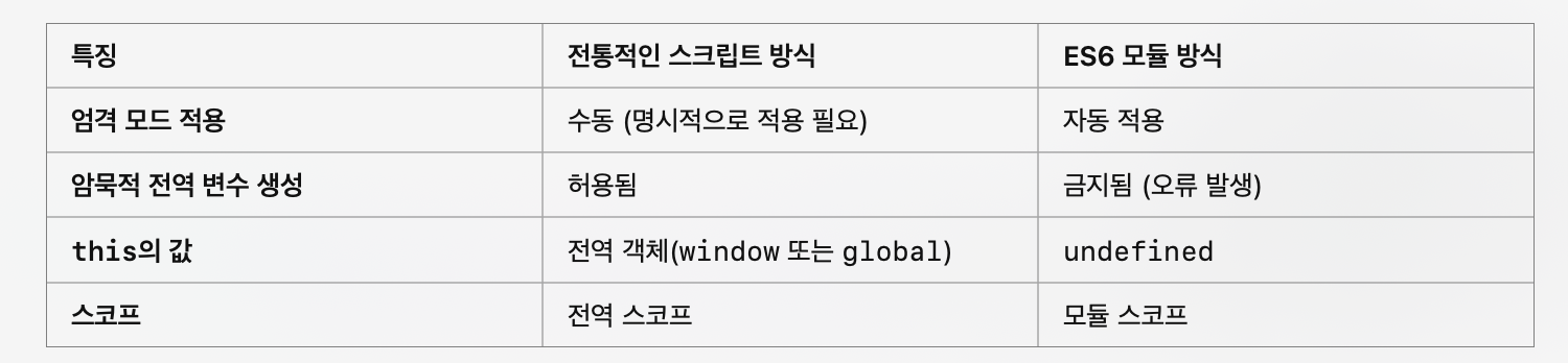 • ES6 모듈 방식에서는 엄격 모드가 자동으로 적용되어, 더 안전한 코드 작성을 보장합니다. 모듈 스코프 내에서 코드가 실행되며, this는 전역 객체를 가리키지 않고 undefined가 됩니다.