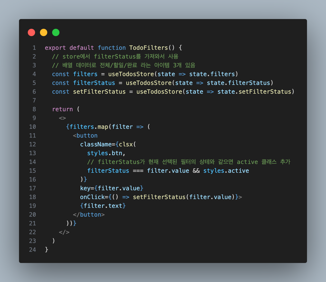 // if문 if (filterStatus === 'all') return true // 필터링 안함 if (filterStatus === 'todo') return !todo.done if (filterStatus === 'done') return todo.done // switch문 switch (filterStatus) { case 'todo': return !todo.done case 'done': return todo.done default: return true }