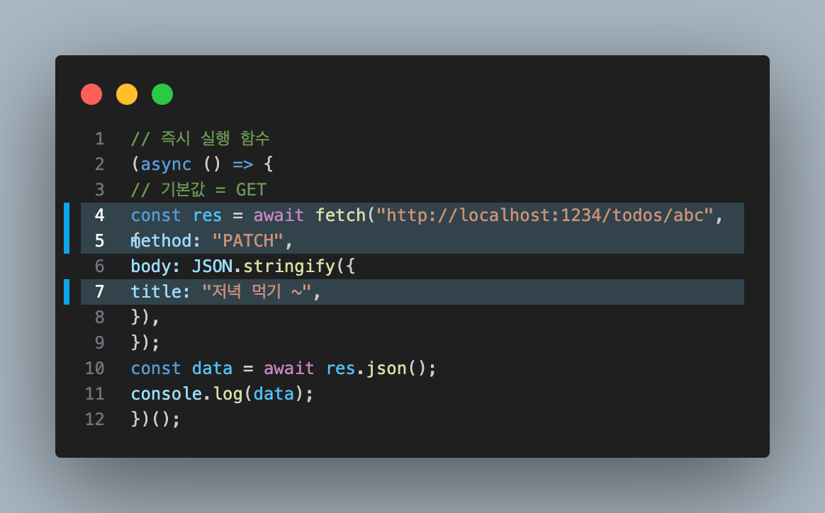 - PATCH 일부 수정 (json-server에서는 일부 수정으로 사용 ! api 마다 다름)
