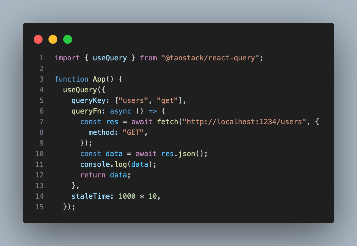 staleTime: 1000 * 10은 데이터가 신선한 상태로 간주되는 시간을 정의합니다. 이 경우 10초(1000ms * 10) 동안은 데이터를 다시 가져오지 않고 캐시된 데이터를 사용합니다.