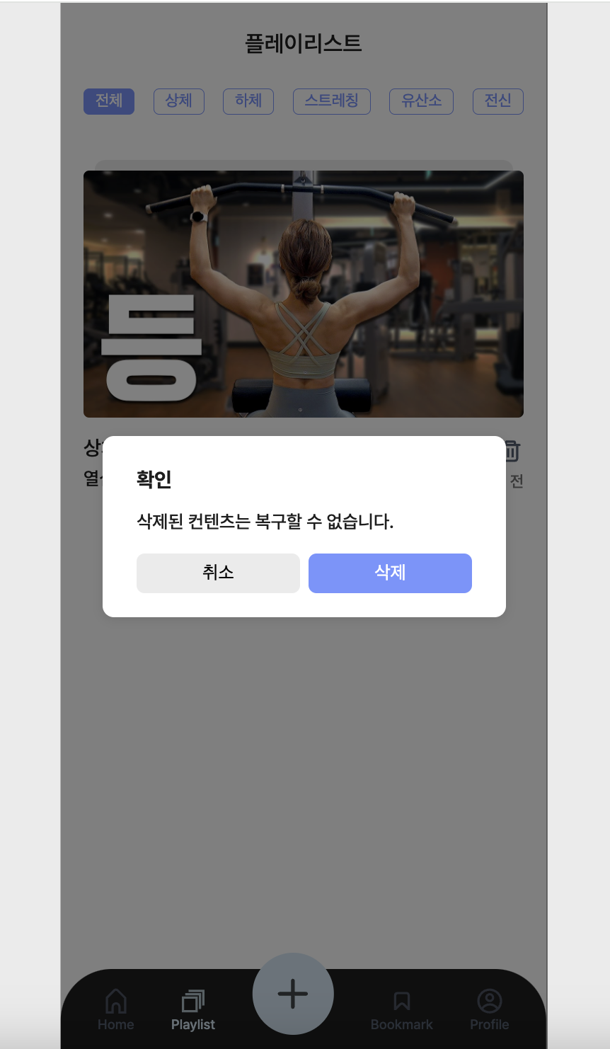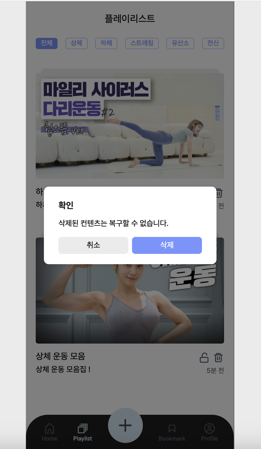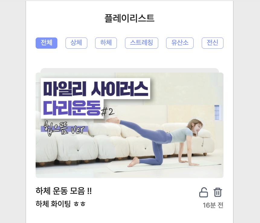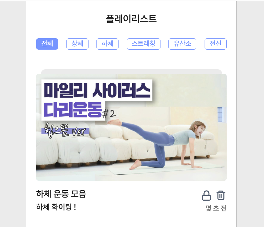 플레이리스트 제목, 설명, 생성 시간, 썸네일이 기본적으로 나오고 공개/비공개 설정에 따라 썸네일 우측 자물쇠 아이콘이 바뀌도록 설정했습니다. 자물쇠 아이콘 옆 삭제 버튼을 누르면 플레이리스트 삭제도 가능한데요, 삭제 버튼을 누르면 '정말 삭제하시겠습니까 ?' 모달이 뜨고 삭제를 누르면 비로소 삭제가 가능합니다.