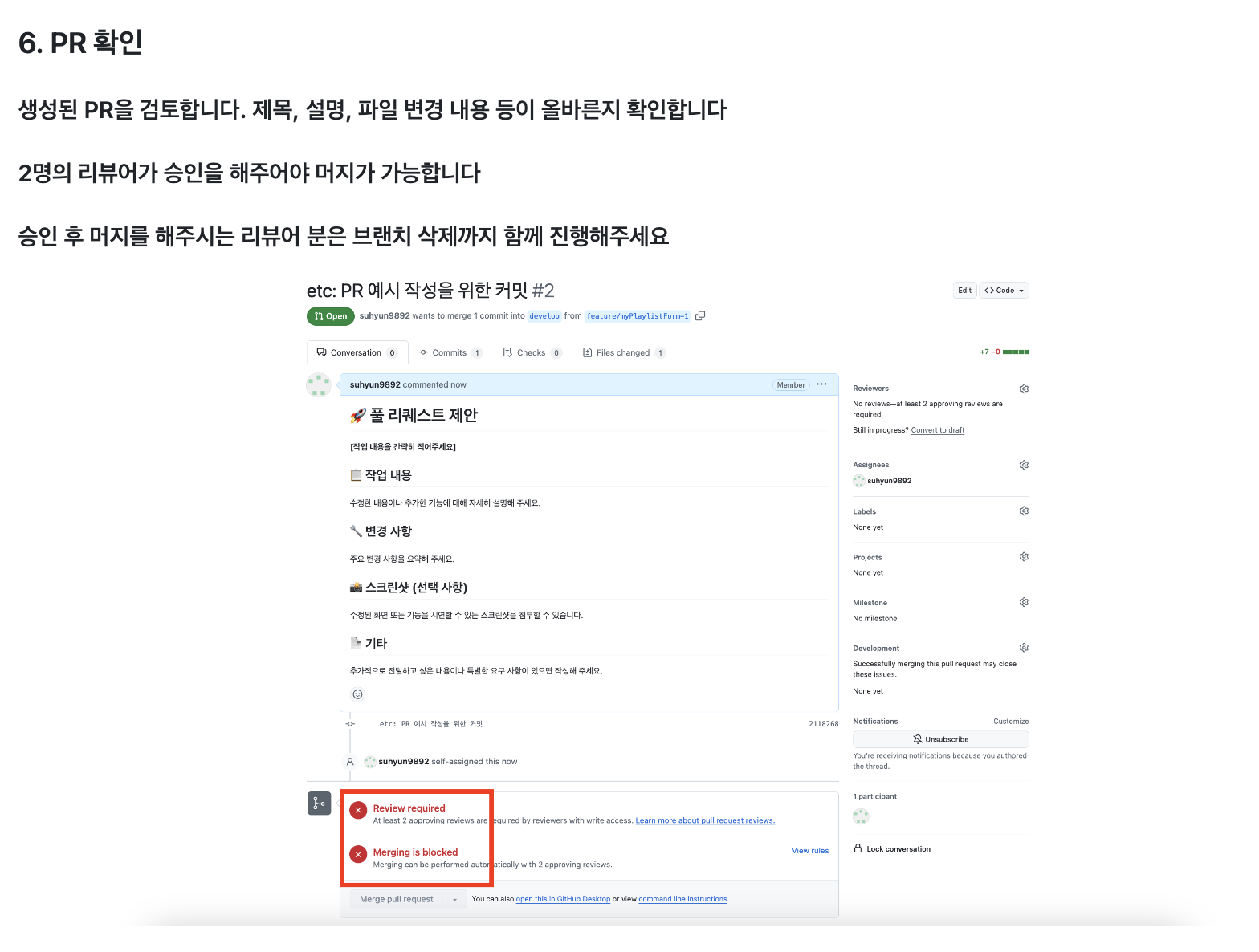 - PR을 올린 자신 이외에 2명의 승인이 있어야 merge할 수 있습니다