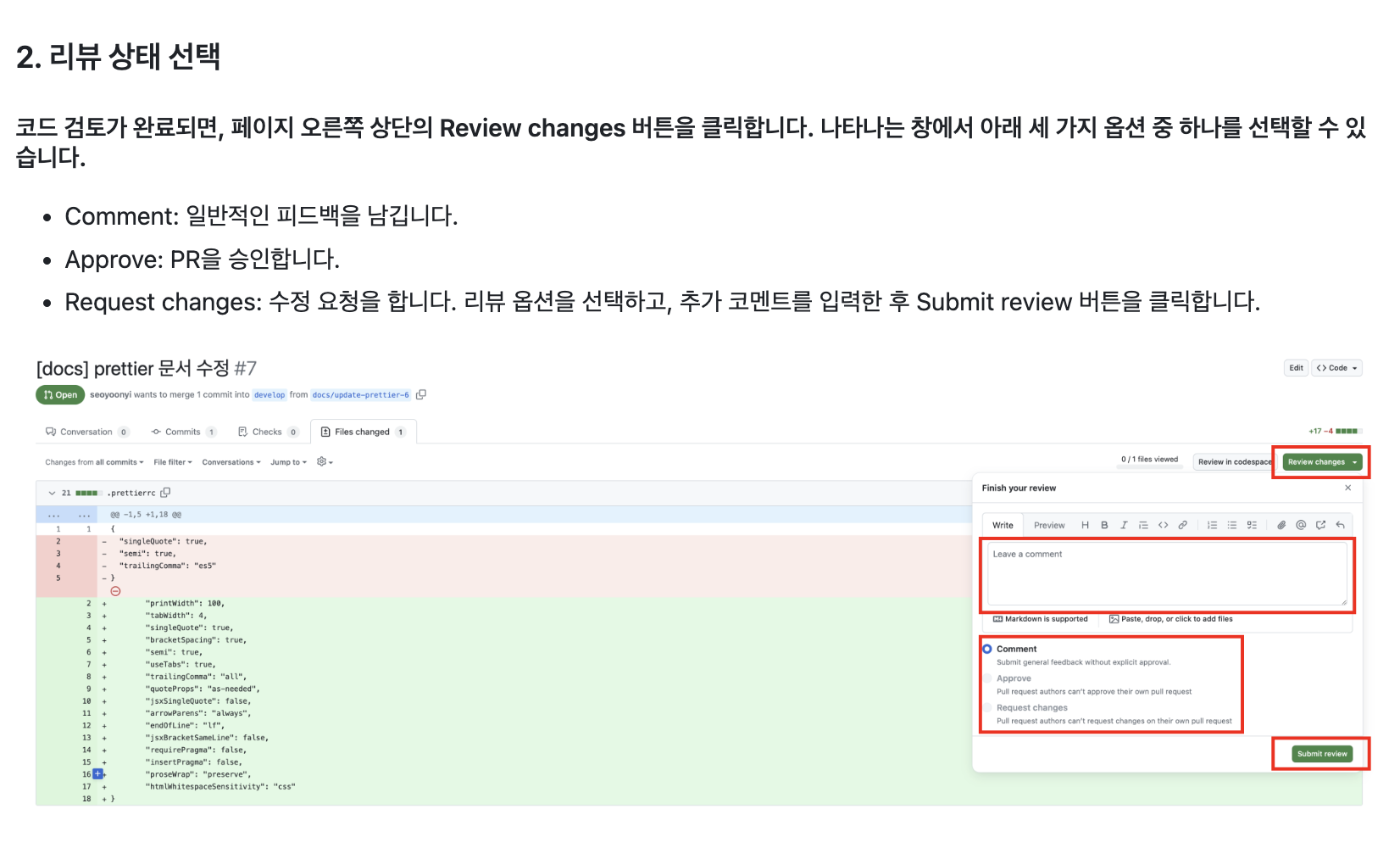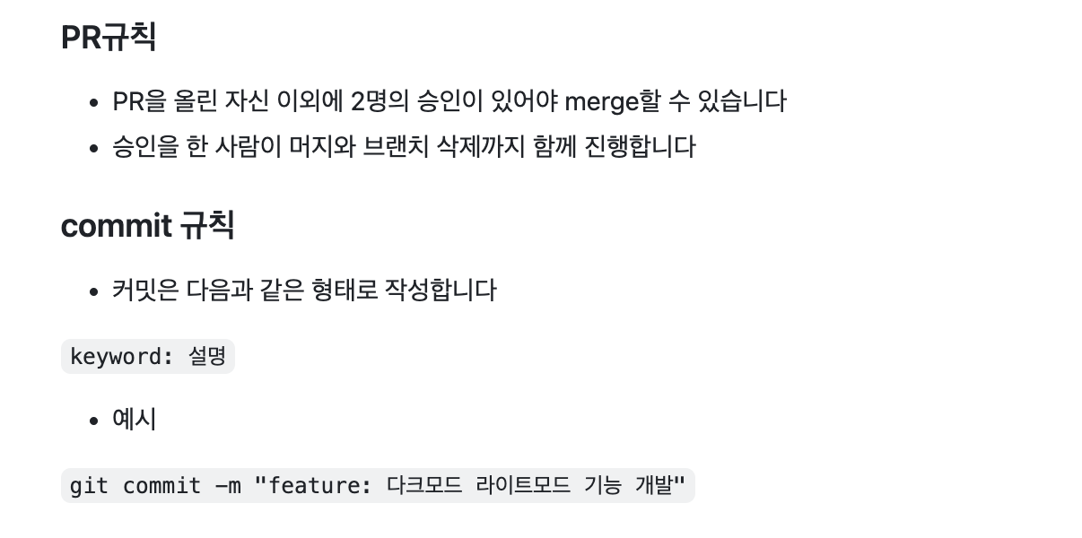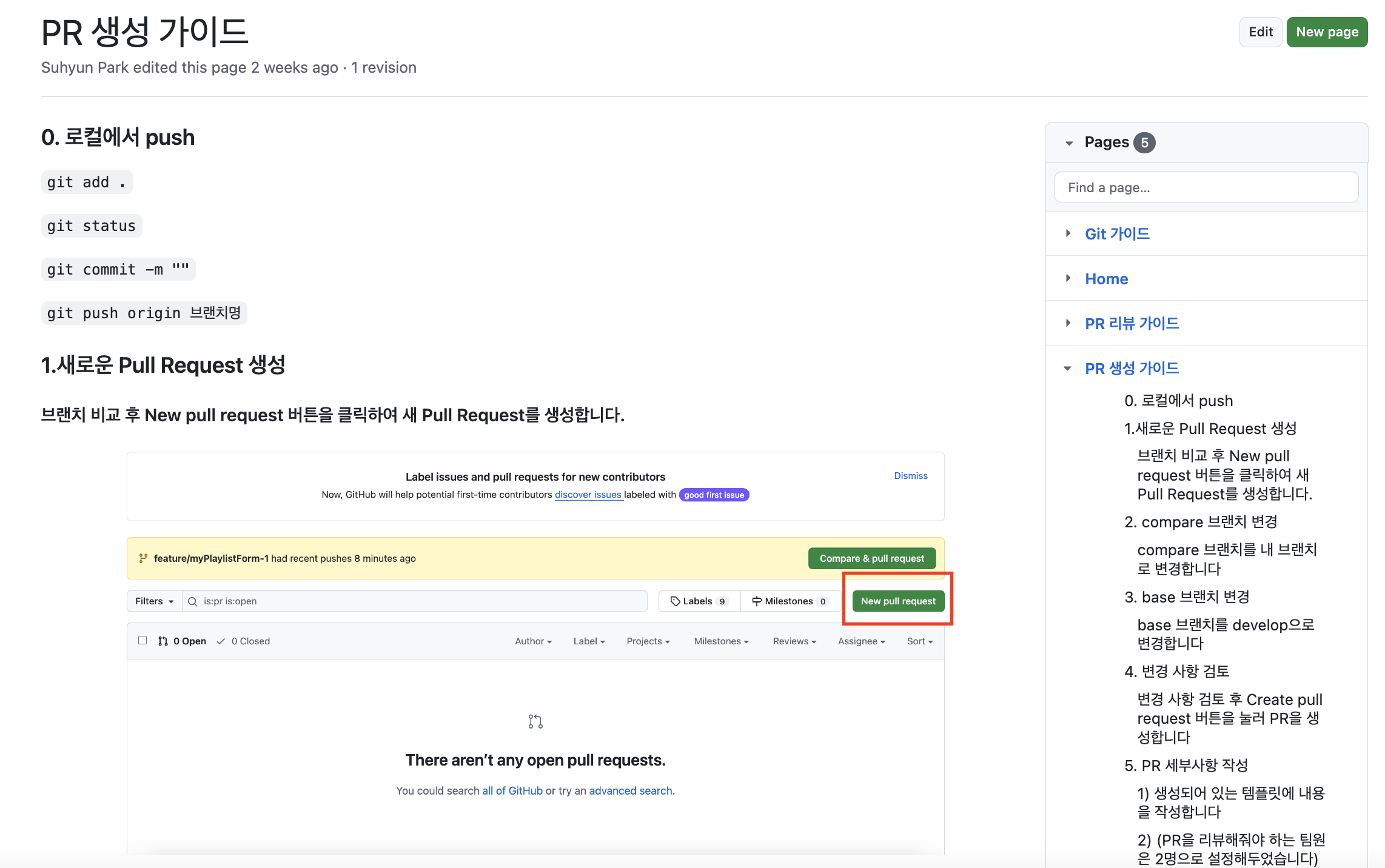 깃허브로 상태 관리 및 협업을 진행하는 것에 익숙하지 않은 팀원들을 위해 이용 가이드를 업로드 하였습니다. 서윤님이 공유해주신 내용을 기반으로 설명 등을 약간 추가하여 저희 팀에 맞도록 수정하며 진행하였고, PR 생성 및 리뷰 방법, 이슈 및 브랜치 생성법, 기타 팀 규칙을 문서화하여 헷갈릴 때 편하게 확인할 수 있게 해보았습니다.