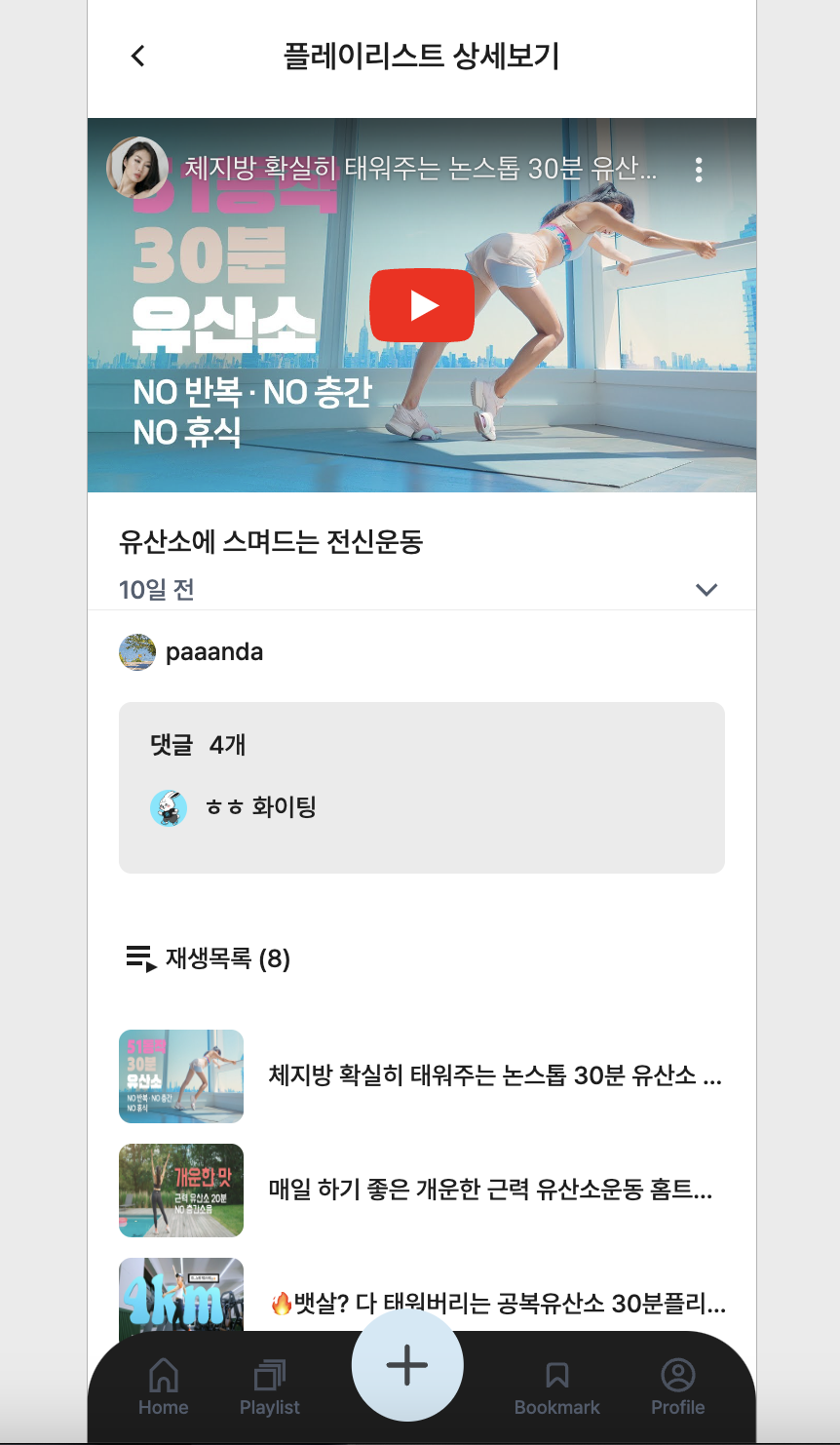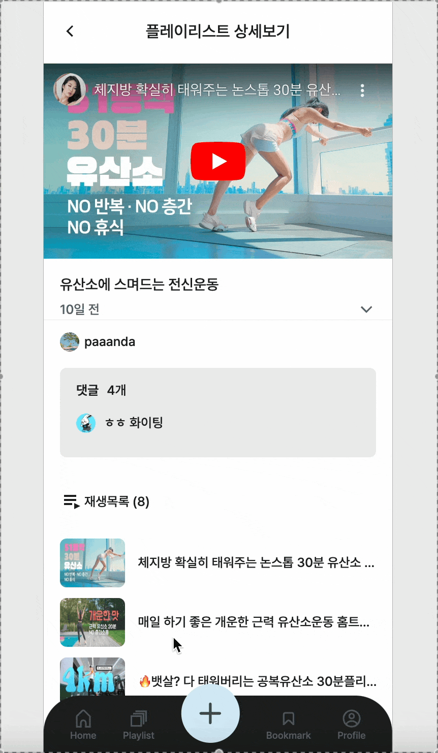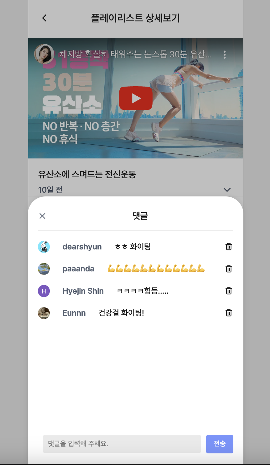 이 페이지에서는 영상 시청 및 댓글을 통해 다른 유저와 소통하는 것이 중심 역할입니다. 다른 유저의 플레이리스트를 시청하는 것이기 때문에 플레이리스트 상세페이지와 달리 공개 비공개 설정이나 정보 수정 및 삭제 기능은 넣지 않았습니다. 모션 효과 이외의 댓글 섹션은 난아님이 구현해주셨습니다. 댓글 부분을 누르면 바텀시트가 나와 댓글을 작성할 수 있고 댓글 삭제가 가능합니다.