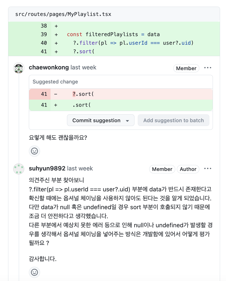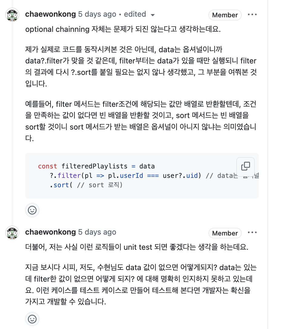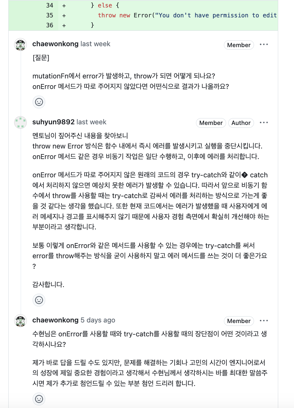 리팩토링은 프로젝트가 끝난 뒤 '9/30 - 10/4'에 진행하였습니다. 코드리뷰용 PR을 올리고 멘토님이 코드 리뷰를 하는 식으로 진행하였습니다. 추가 설명이 필요한 부분은 Zoom에서 진행한 실시간 멘토링을 통해 해결하였습니다. 이 과정에서 onError를 사용하는 것과 에러를 throw 했을 때의 장단점과 차이점, 옵셔널 체이닝 사용 시 주의점 그리고 유닛 테스트에 대한 중요성을 알게 되었습니다.