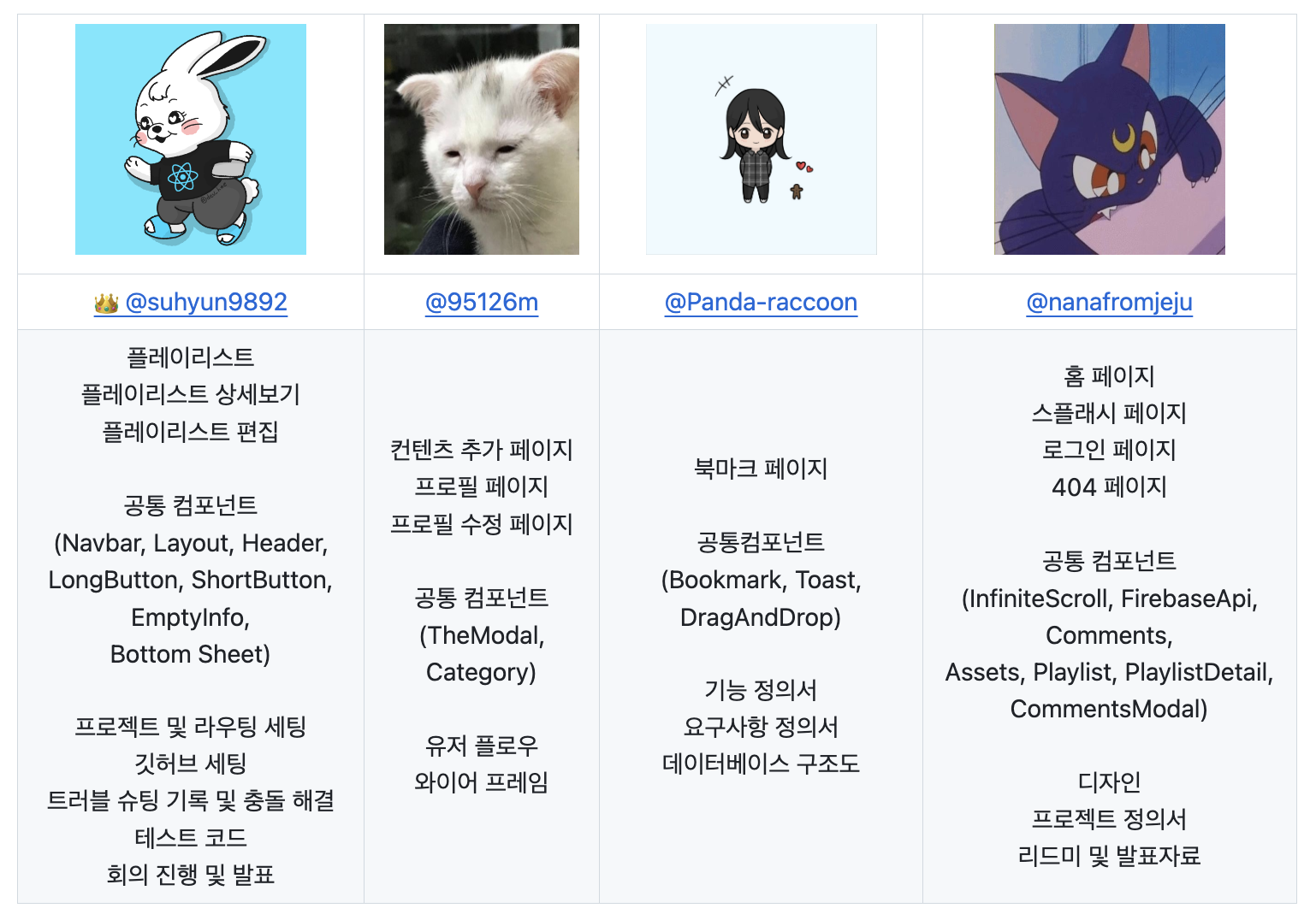 처음에는 7명으로 시작했던 비기너반이 최종적으로는 4명이 되어 프로젝트를 진행하였습니다. 특히나 프로젝트가 시작되고 기획 및 디자인 단계에서 두 분이나 개인 사정으로 부트캠프를 하차하게 되면서 충분하지 않은 시간 동안 완성할 수 있을지 걱정이 많이 되었지만 팀원 모두가 추석이나 정규 프로그램을 따라가야하는 우여곡절 속에서도 최선의 노력을 해주셨기에 프로젝트 완성을 할 수 있었습니다.