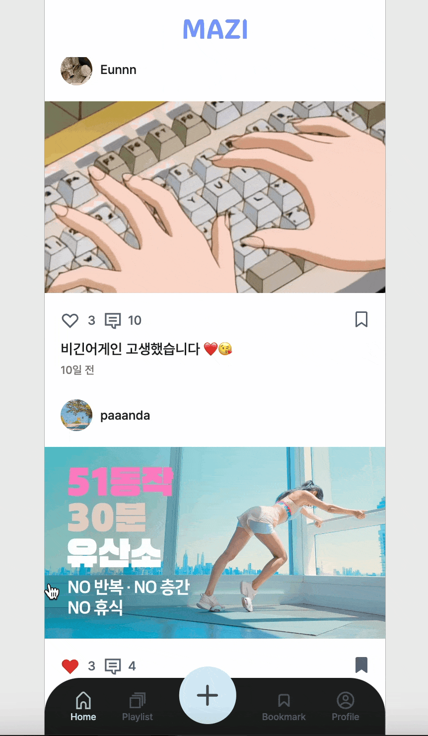 좋아요 기능과 북마크 기능이 있고 댓글 버튼을 누르면 상세페이지로 이동하며 북마크 버튼을 누르면 북마크 페이지에 저장됩니다.