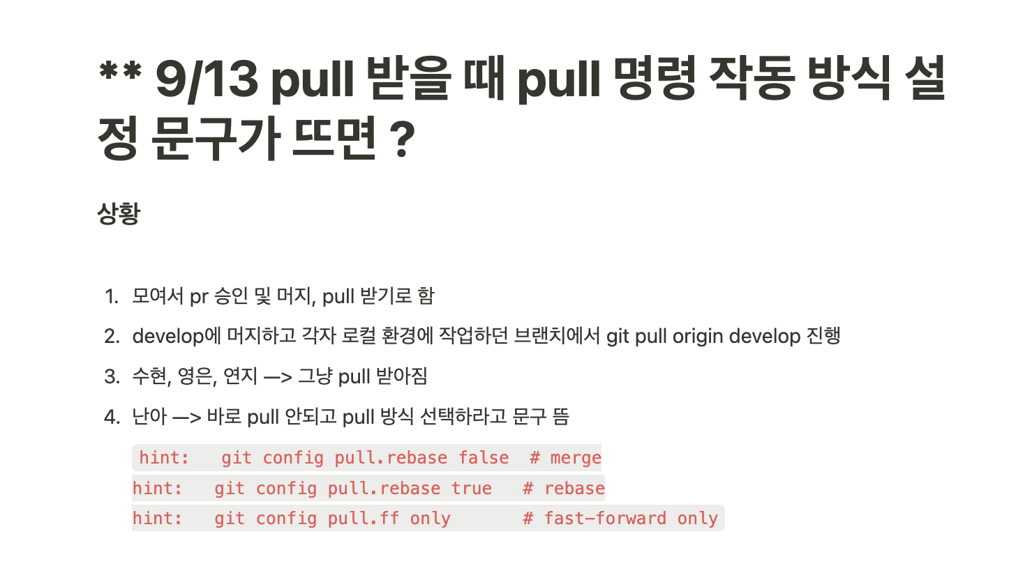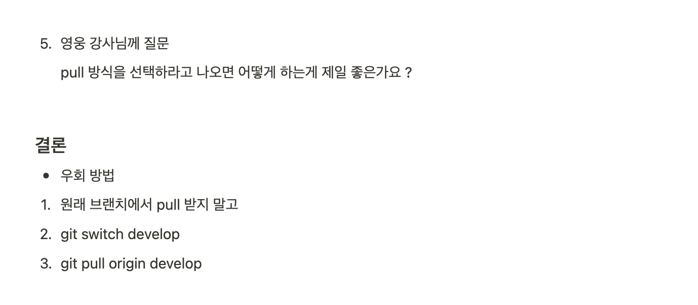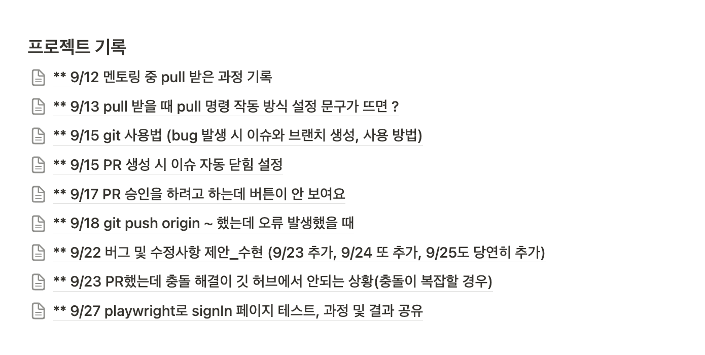 두 번째, 노션에 트러블 상황을 정리하기 시작했습니다. 하단에 첨부된 사진과 같이 어떤 문제가 발생한 상황을 구체적으로 설명하고 어떻게 해결했는지를 정리해두어 추후 비슷한 상황이 발생했을 때 당황하지 않고 빠른 대응이 가능하도록 해보았습니다. 또한 혜진님께서 도움을 주신 부분인데, Git을 사용하면서 특히 버그가 발생했을 때, 개발 중 develop 브랜치가 업데이트 되었을때, 로컬에서 브랜치 생성하는 방법 등을 명령어와 함께 설명해주셔서 이를 정리하여 팀원들께 공유할 수 있었습니다. 이는 Git을 사용할 때 매우 유용한 참고자료로 사용할 수 있었습니다.
