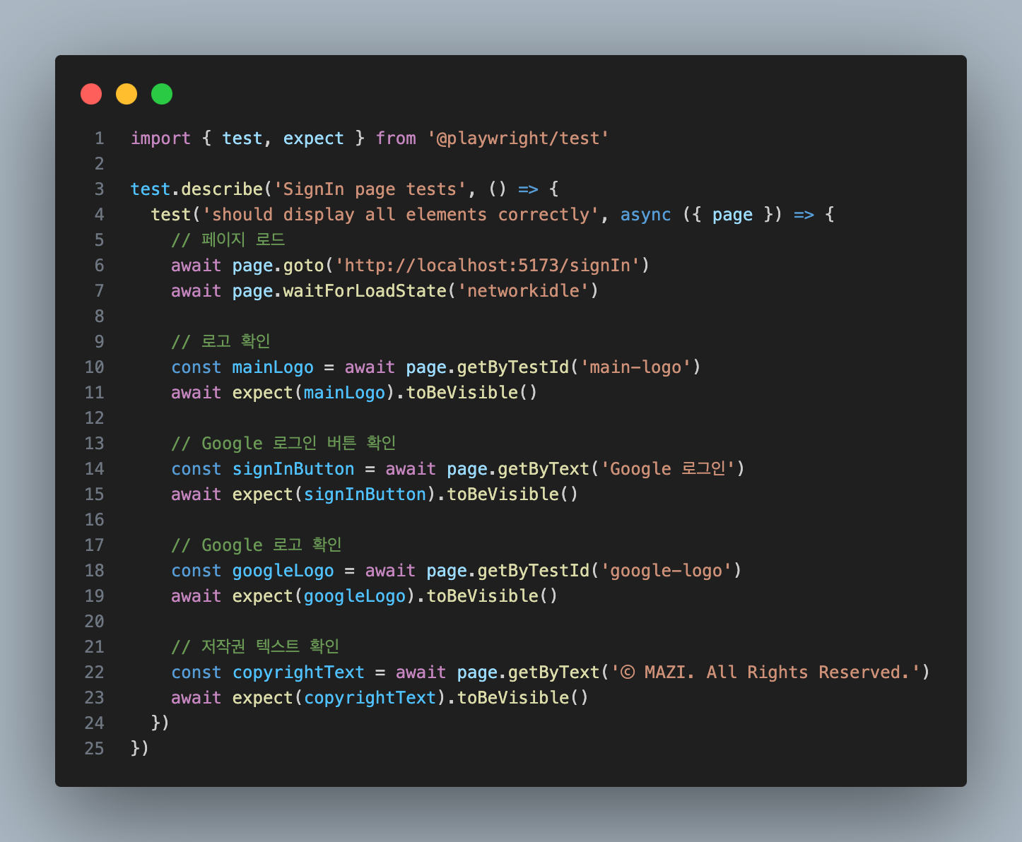 테스트는 playwright를 사용하여 진행하였습니다. 시간이 넉넉하지 않아 로그인 화면 정도 테스트 코드를 구현해보았습니다.
