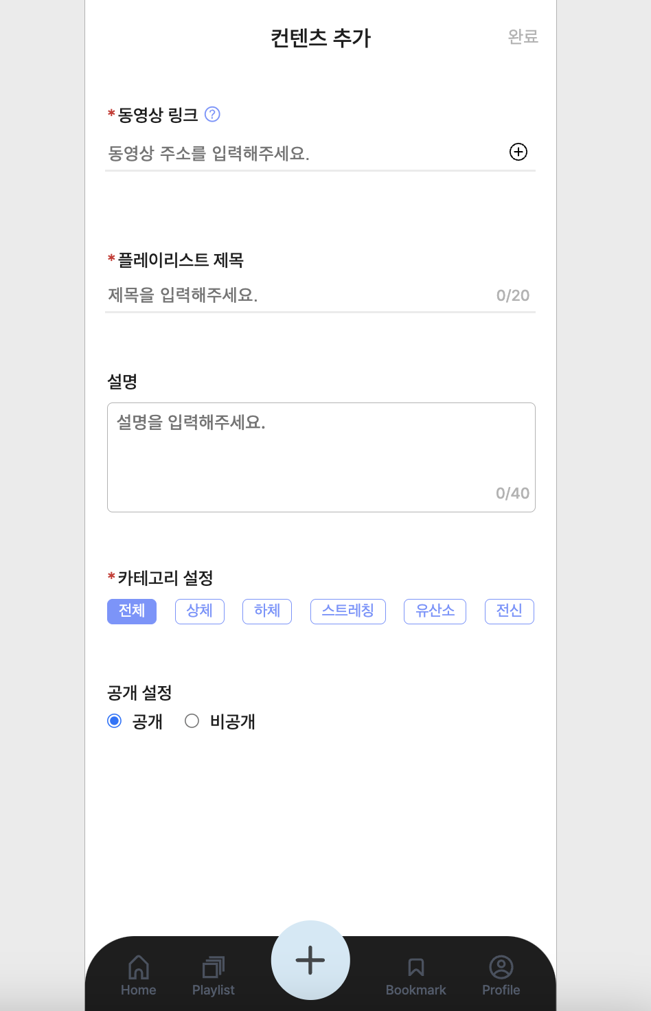 플레이리스트 추가 페이지는 영은님이 구현해주셨습니다. 글자수 제한이라던지 툴팁과 같은 부분을 통해 페이지의 완성도를 높였습니다.