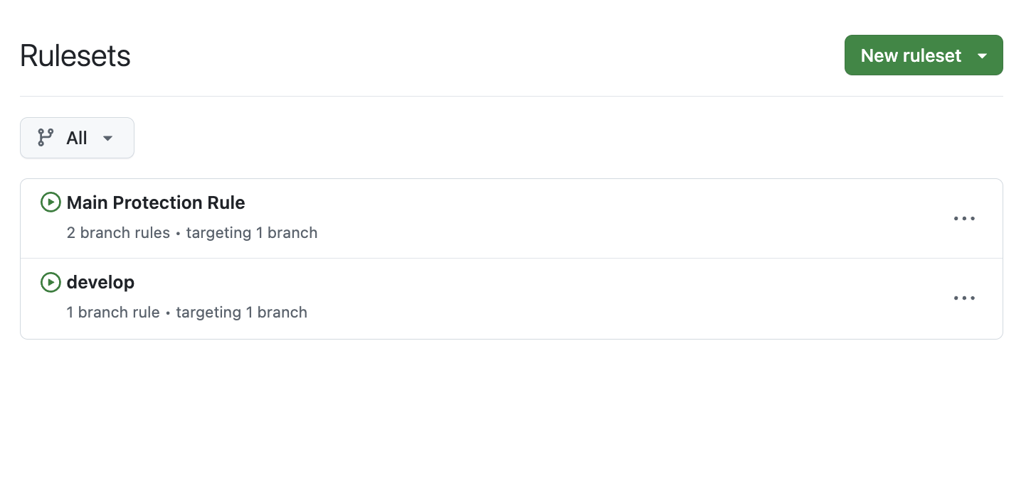 첫 번째, GitHub 자체에서 설정할 수 있는 Rulesets를 활용했습니다. 규칙을 설정함에 있어서 서윤님이 많이 기여해주셨는데, 서윤님이 제안해주신 방법은 main에 합병하는 PR의 경우 승인을 받아야 하는 팀원의 수를 3명으로, develop에 합병하는 PR의 경우에는 승인을 받아야 하는 팀원의 수를 2명으로 차이를 두어 혹시나 모를 상황을 미연에 방지하는 방법이었습니다. 실제로 이 규칙을 설정해 놓은 덕분에 한 두번정도 main으로 합병을 시도한 PR이 승인 과정에서 발견되었고 main에 합병되는 상황을 보호할 수 있었습니다.