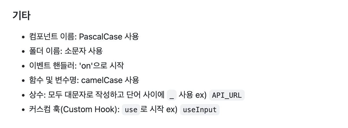 - 상수: 모두 대문자로 작성하고 단어 사이에 _ 사용 ex) API_URL